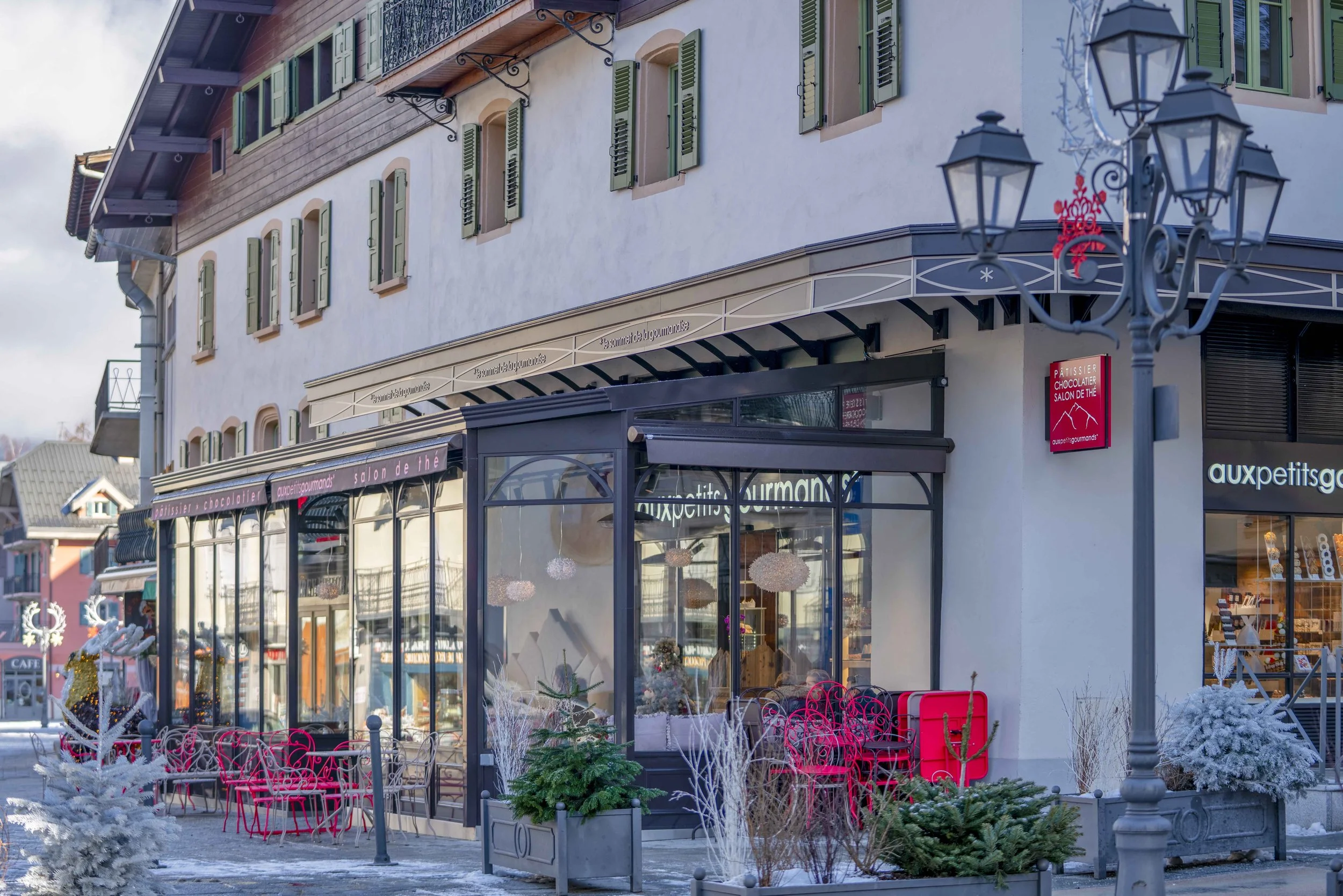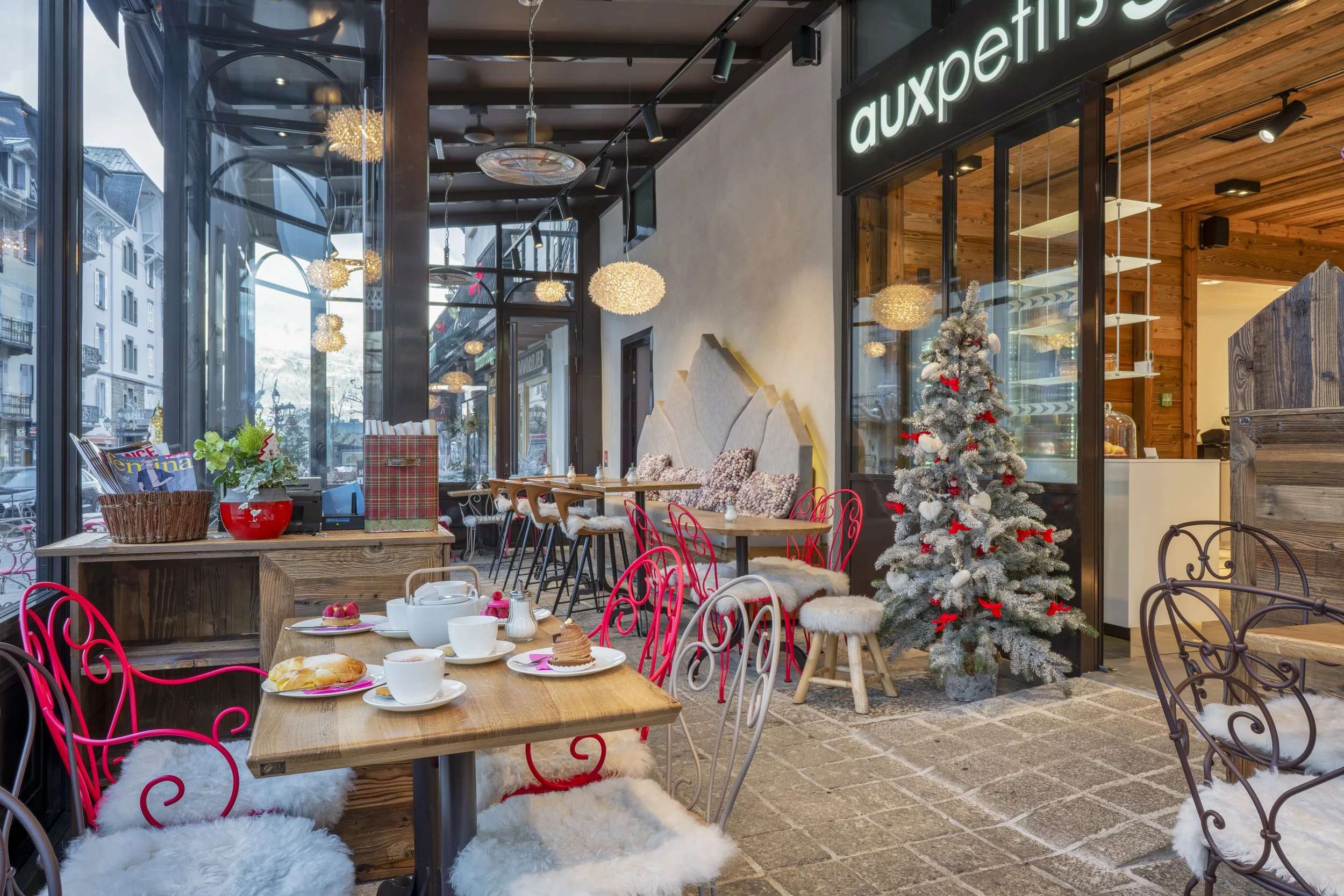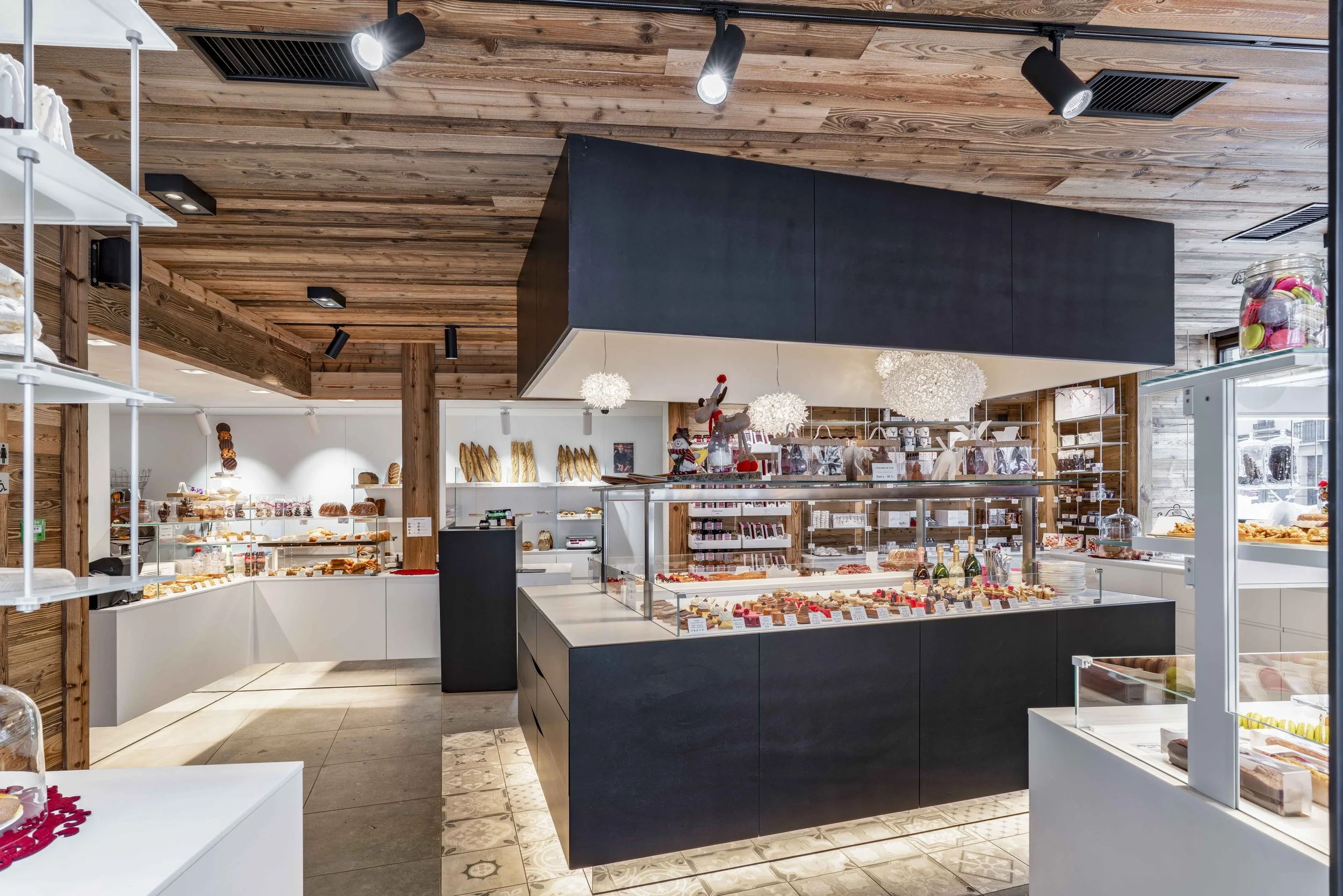 Aménagement de la boutique de pâtisserie chocolaterie Aux Petits Gourmands, un espace chaleureux et élégant mêlant bois brut et lignes contemporaines, offrant aux consommateurs un expériences visuelle et gustative raffinée. Création d’une véranda s’intégrant parfaitement dans le village de Saint-Gervais.