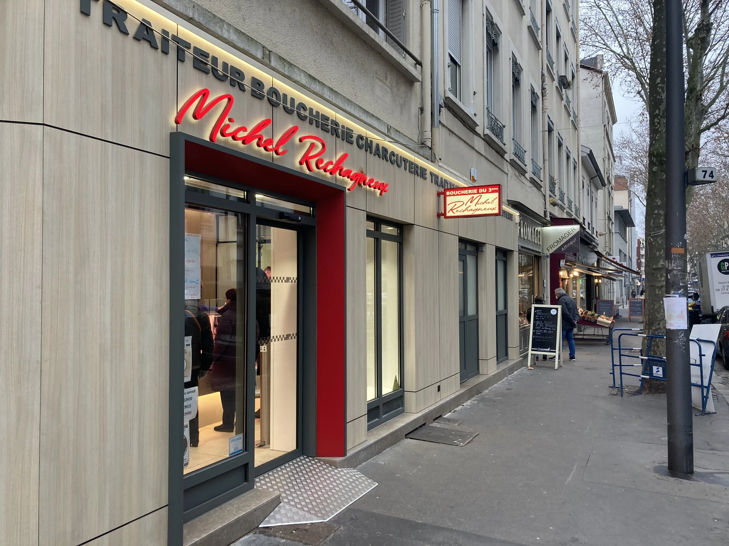 Aménagement de la boutique de boucherie, traiteur dans un univers réchauffé par le bois et les lignes courbes contemporaines mettant en valeur cet espace.