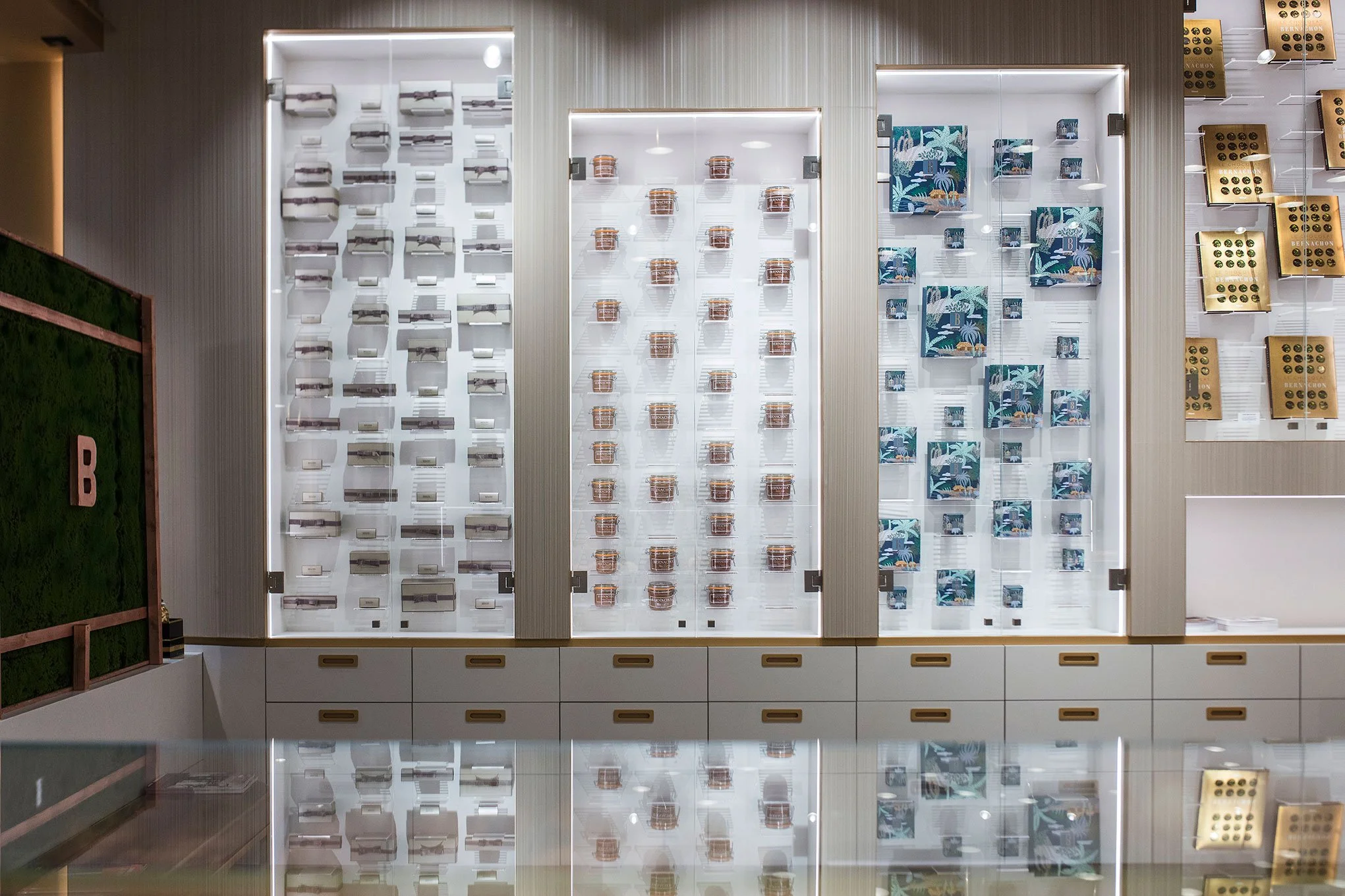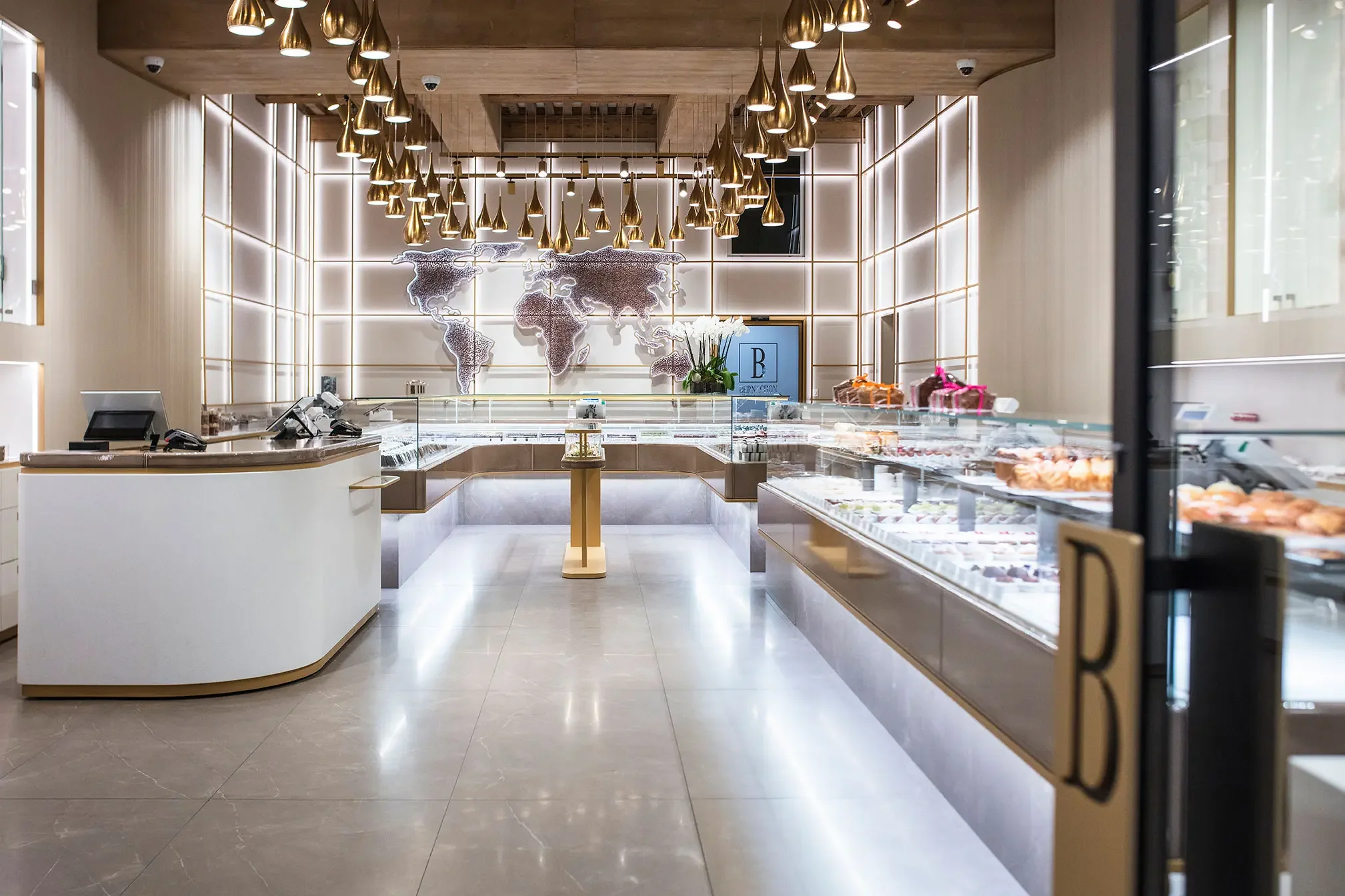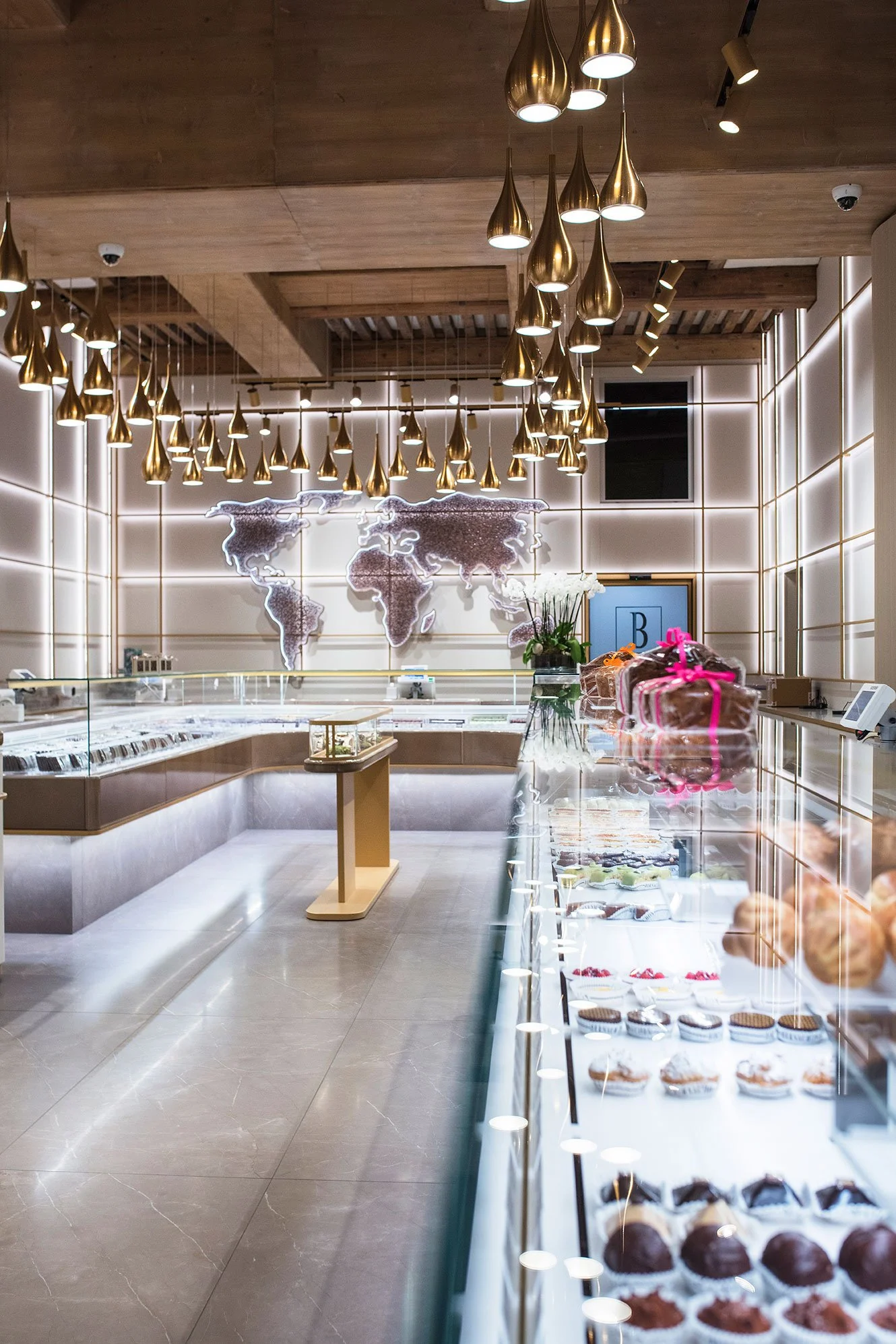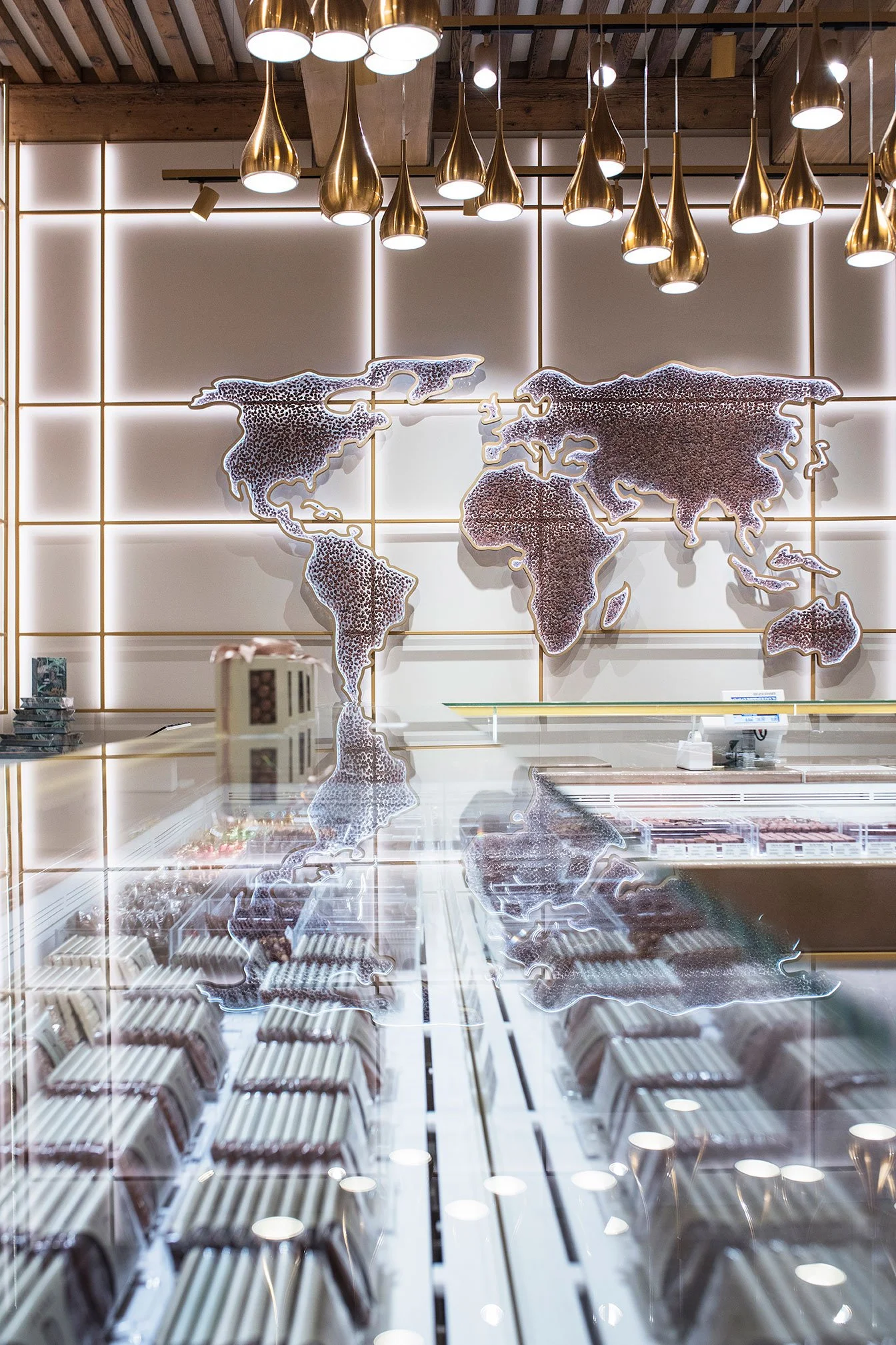 Aménagement de la boutique (espace de vente et laboratoire), avec création d’une signalétique originale : un planisphère en fèves de caco.