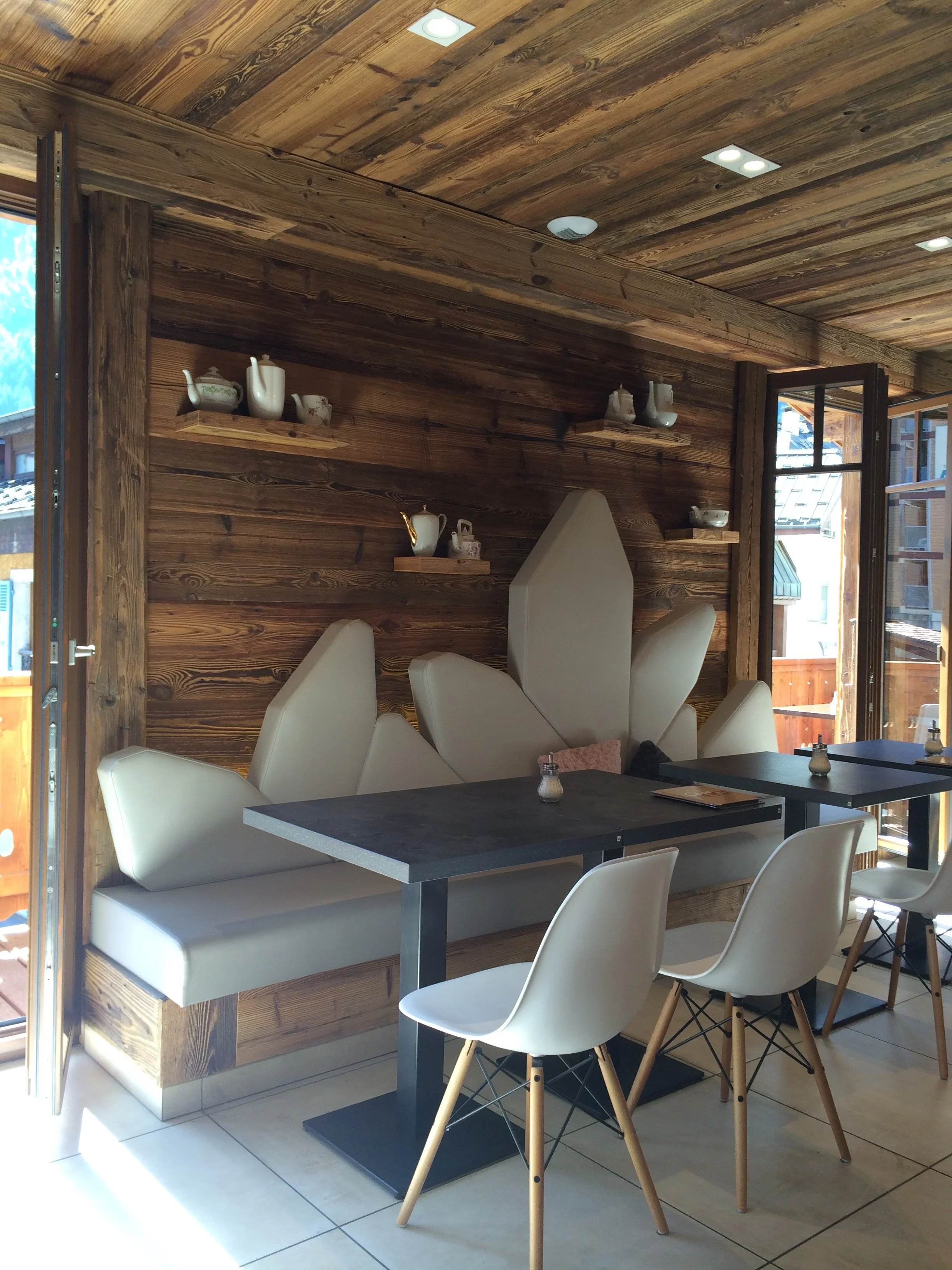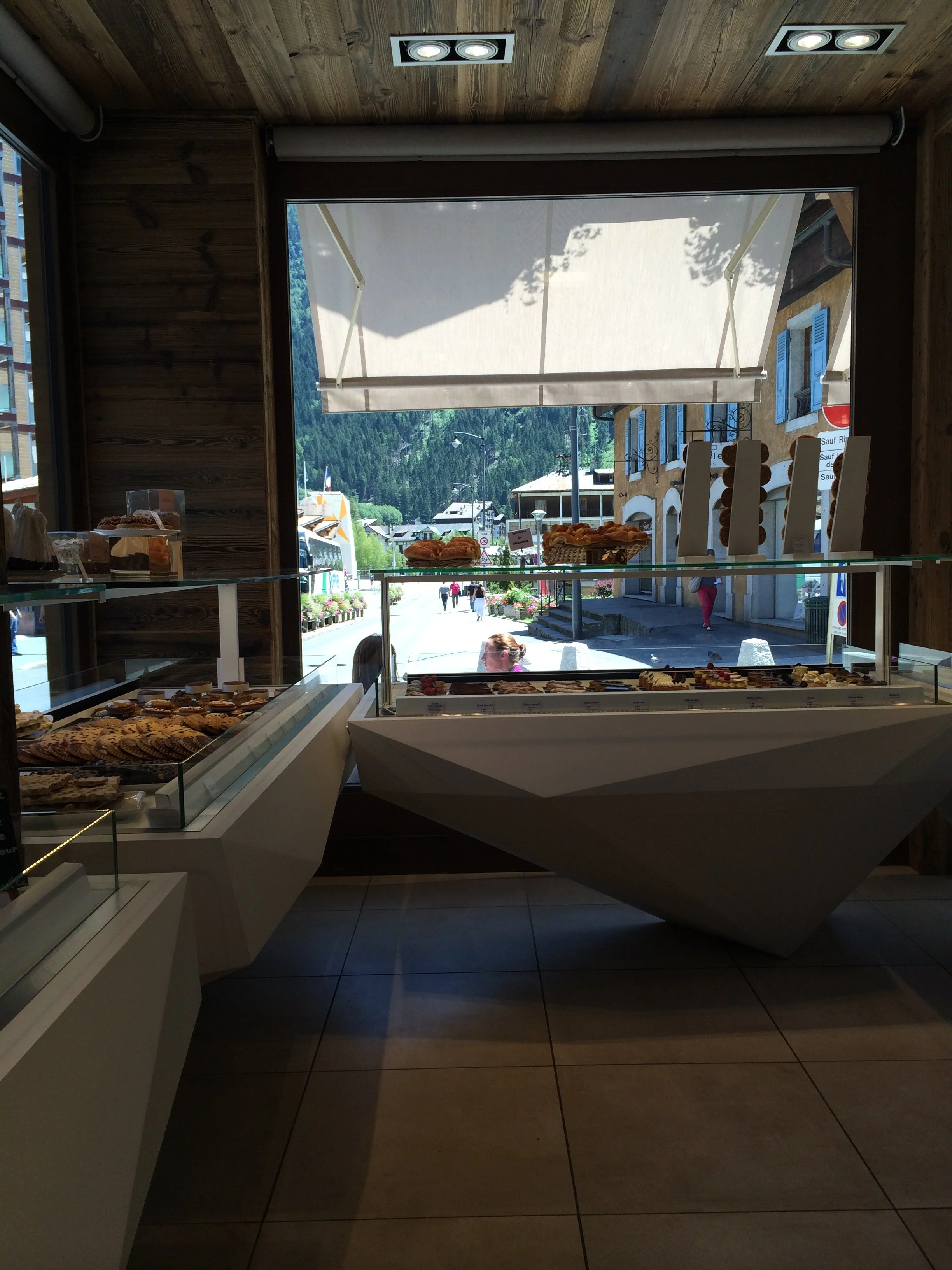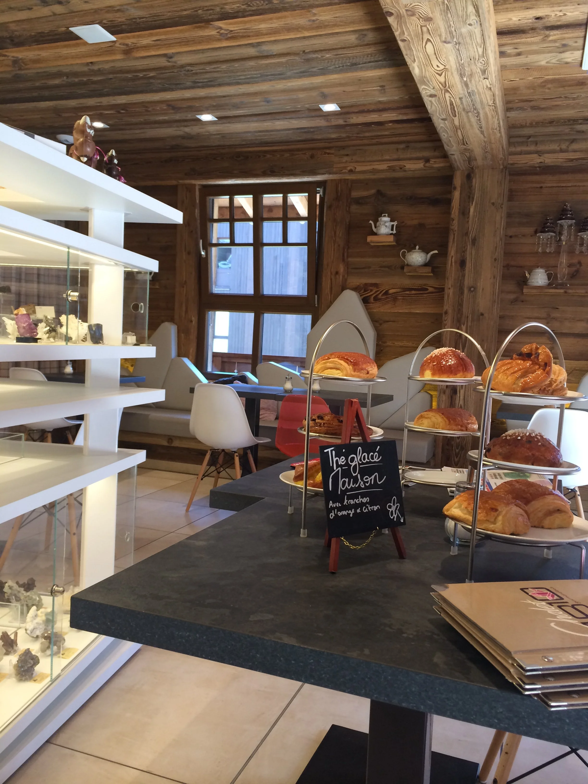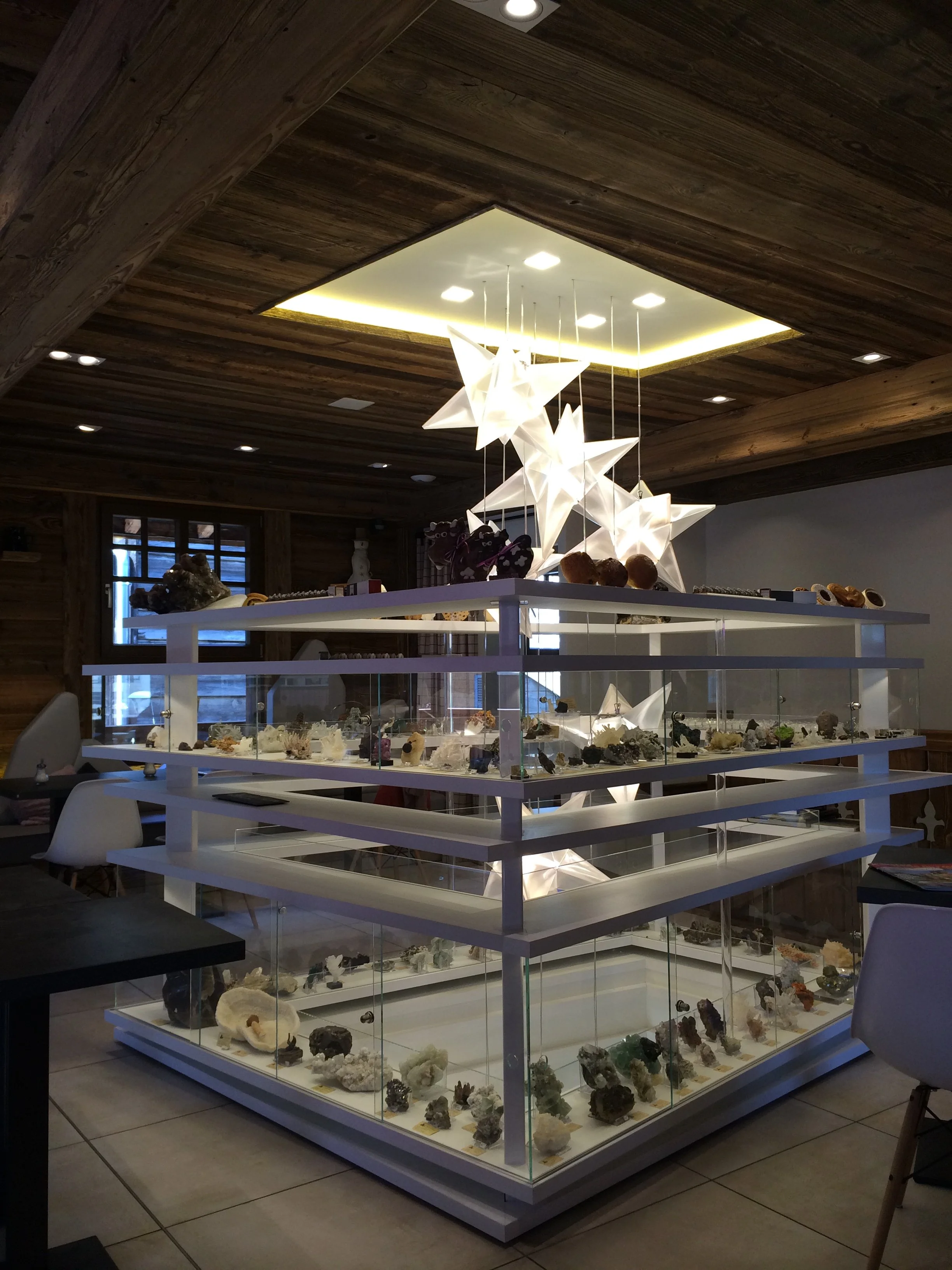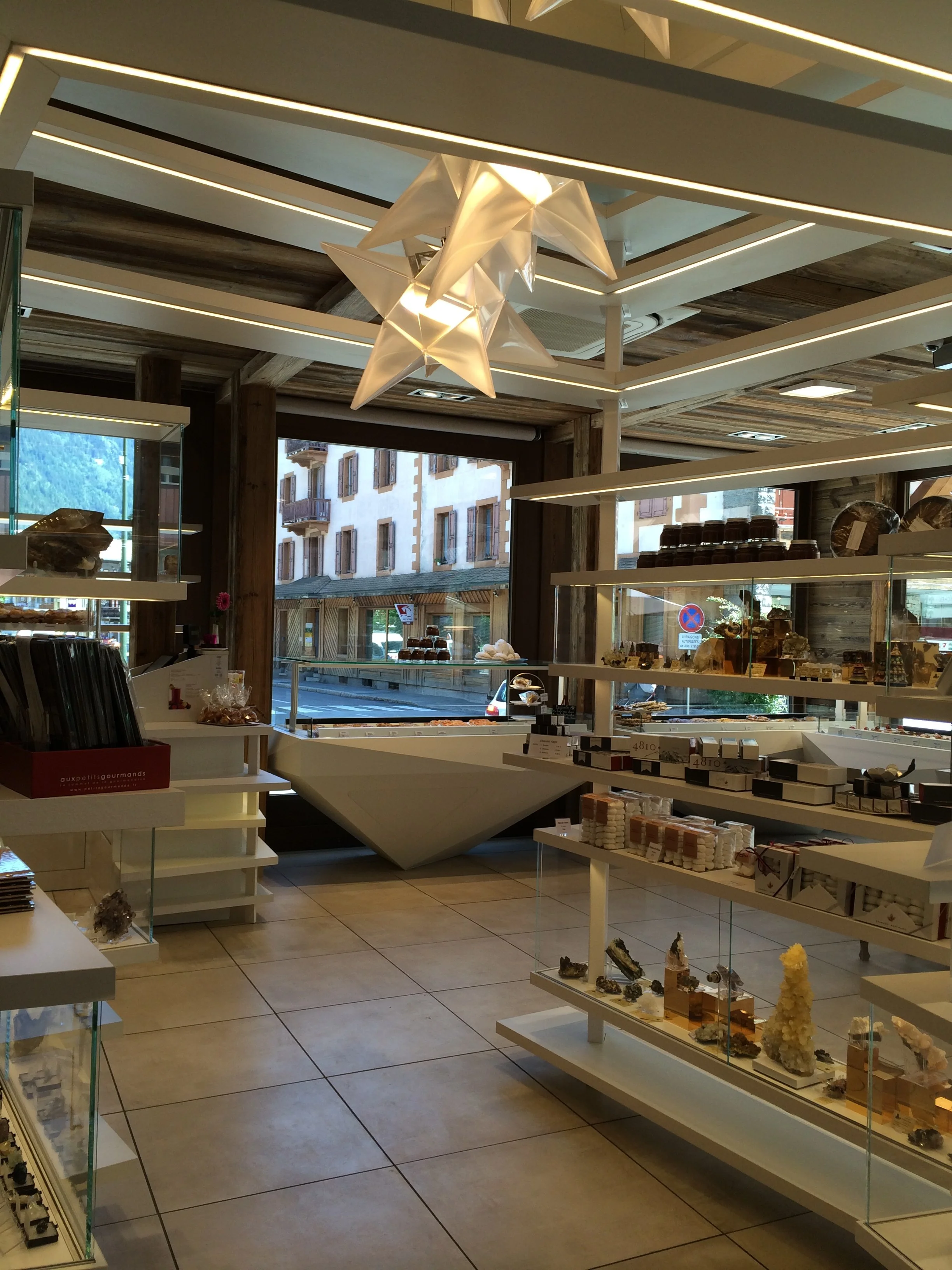 Aménagement de la chocolaterie, pâtisserie, et salon de thé Chalet 4810, dans un joli petit chalet entièrement rénové en plein cœur de Chamonix. A l’intérieur, les produits se mêlent aux minéraux en exposition.