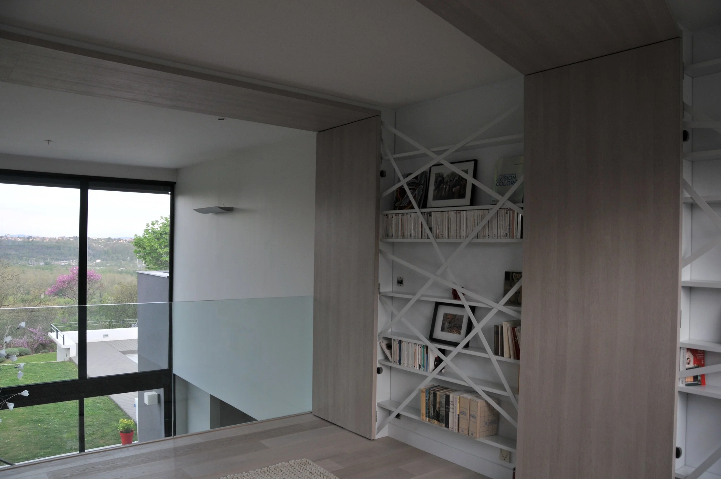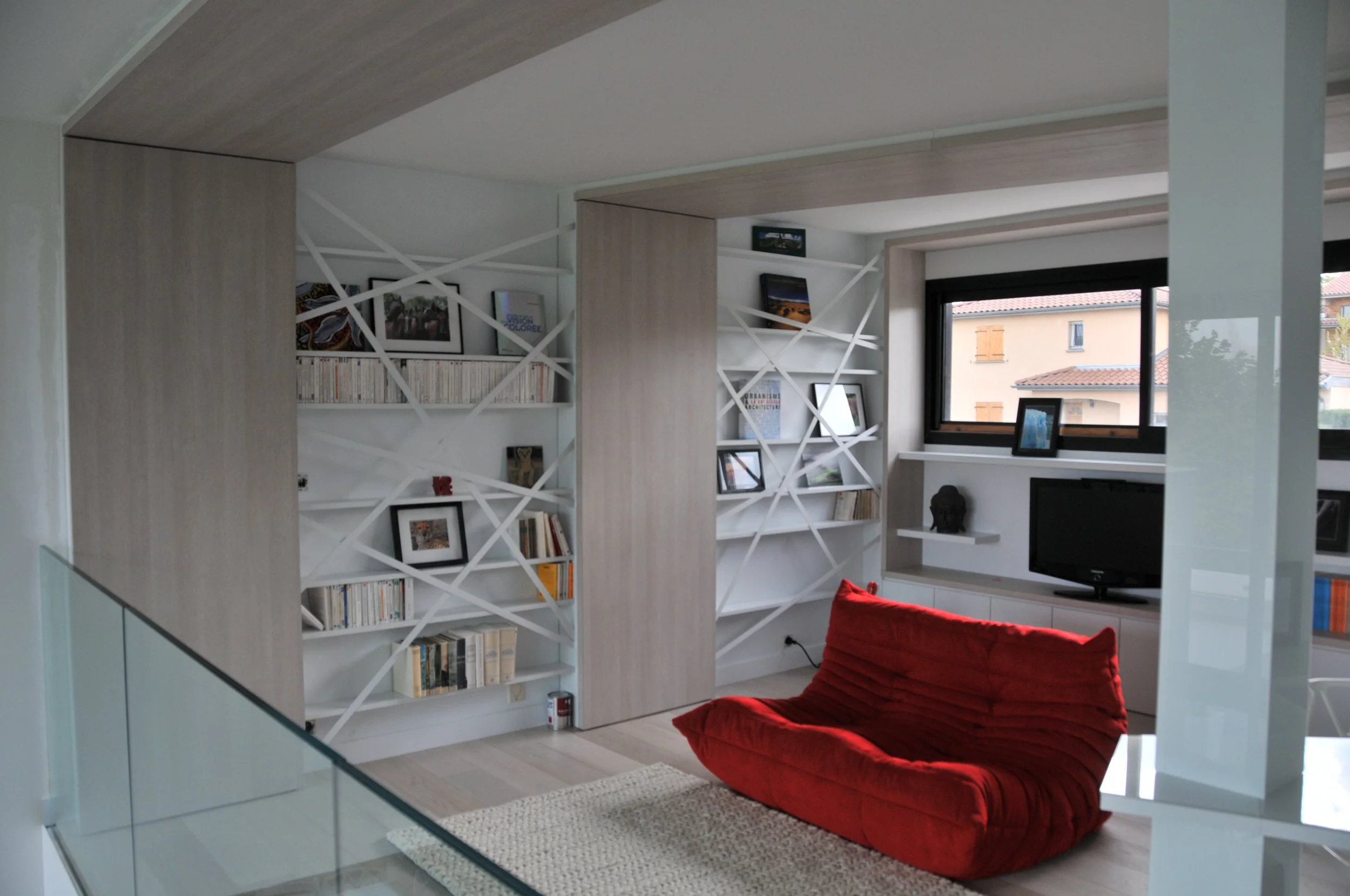 Aménagement d’un espace de vie aux lignes sobres, combinant matières nobles, éclairages intégrés et éléments graphiques pour créer un espace élégant.