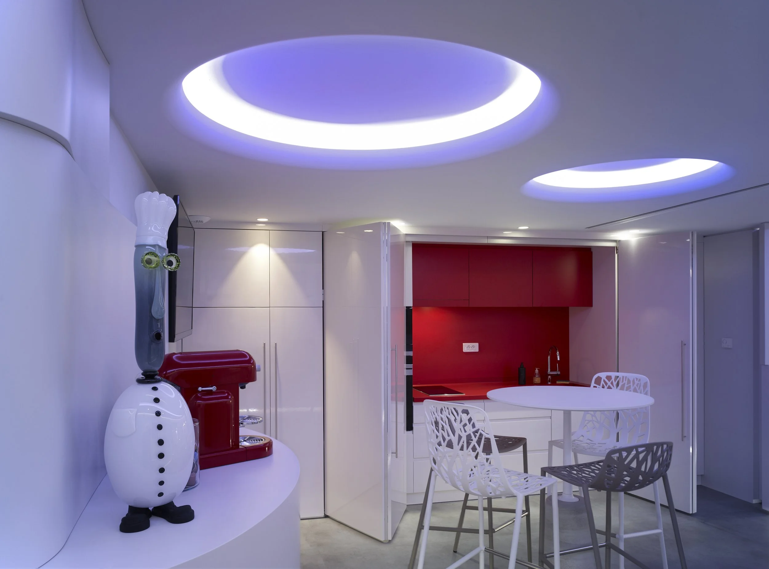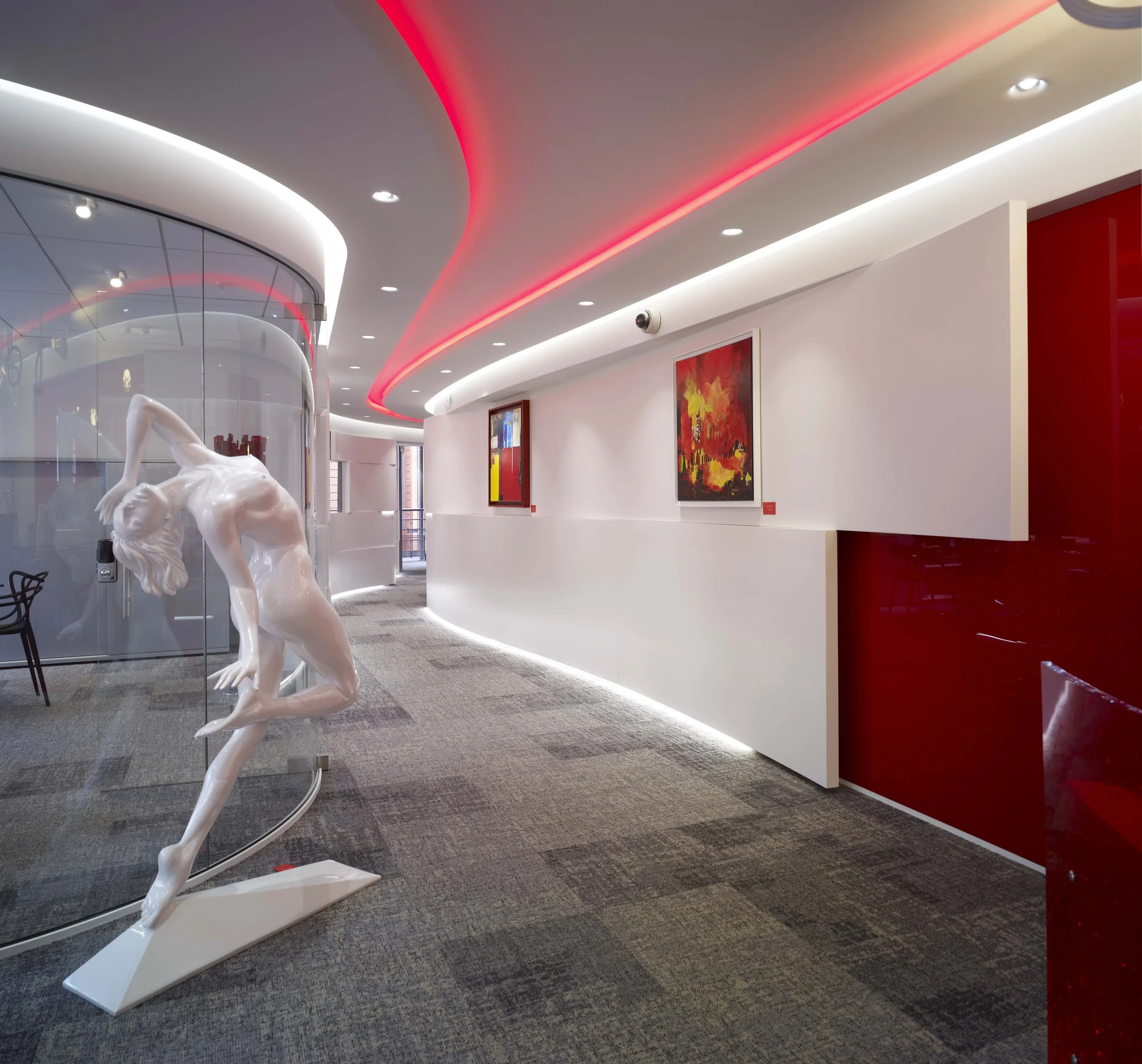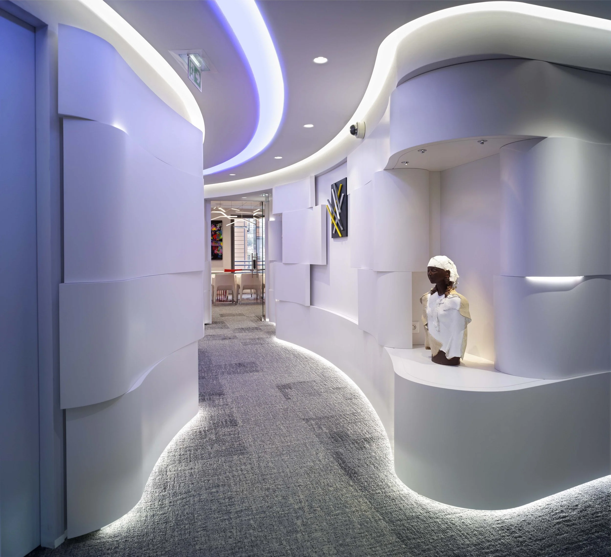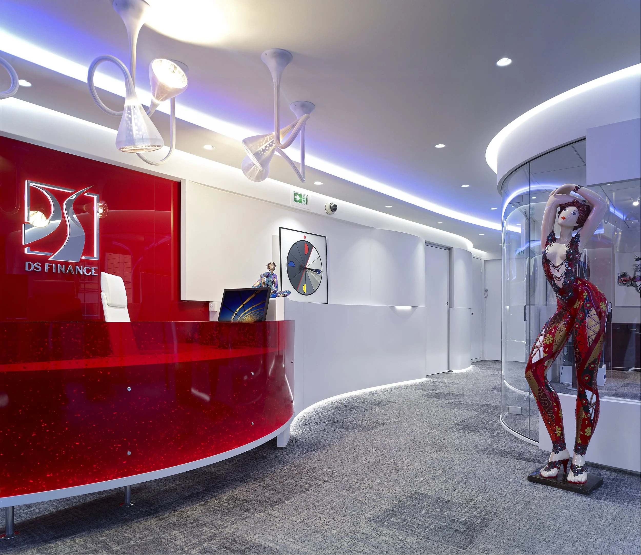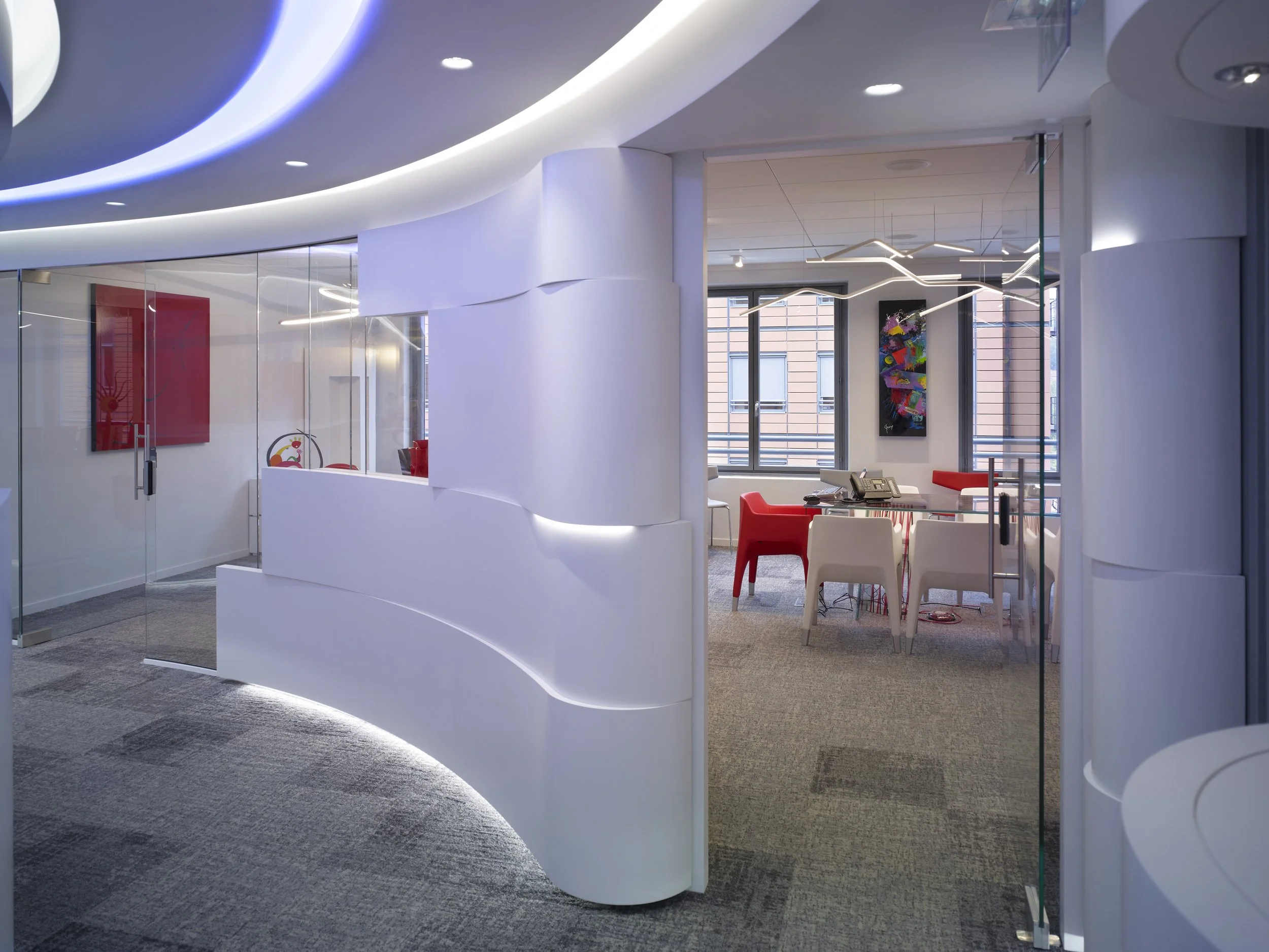 Aménagement des bureaux (espaces d’accueil, bureaux, salles de réunion, petits salons), esprit galerie, en adéquation avec la personnalité du dirigeant, un amateur d’art.
