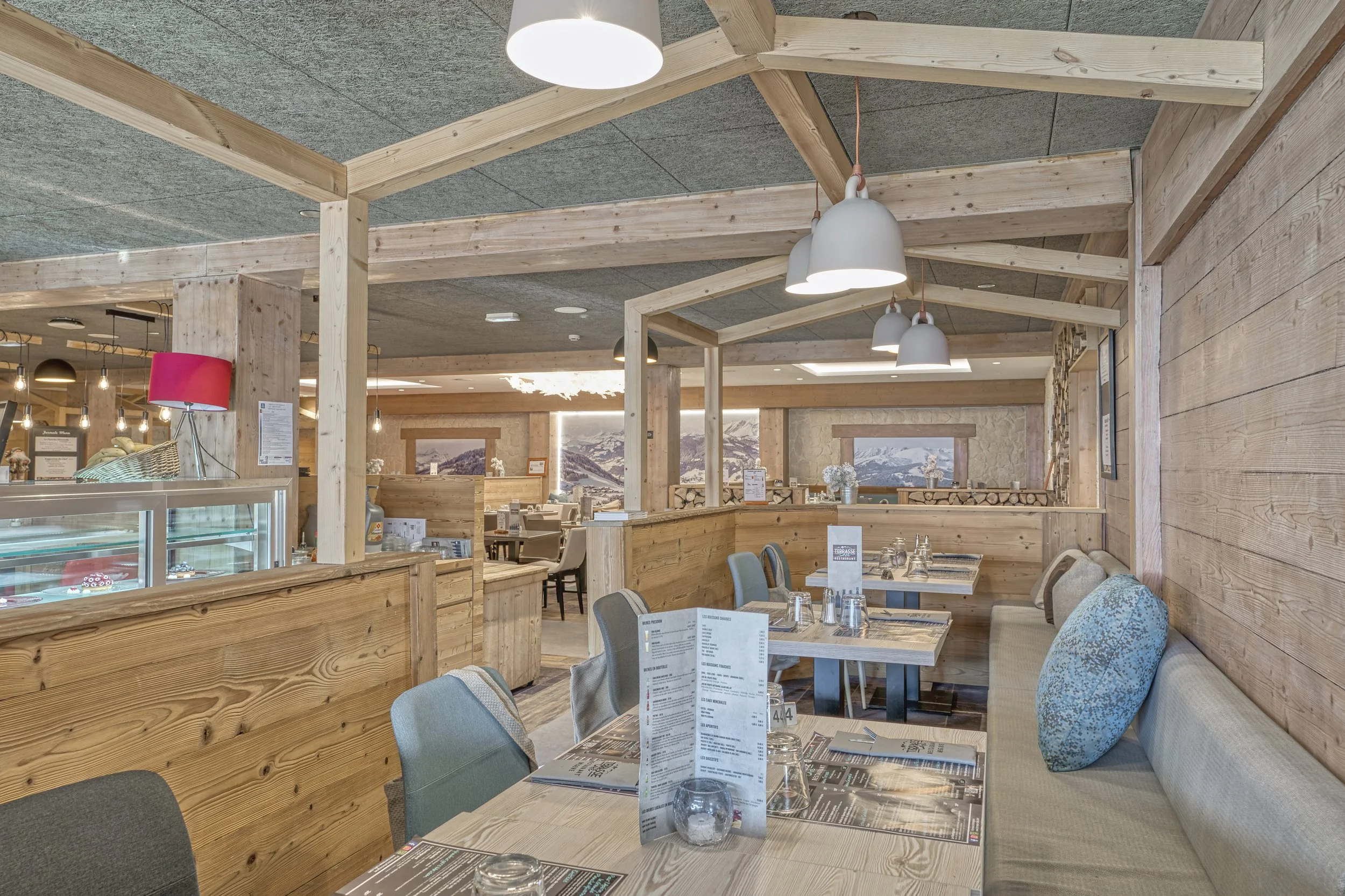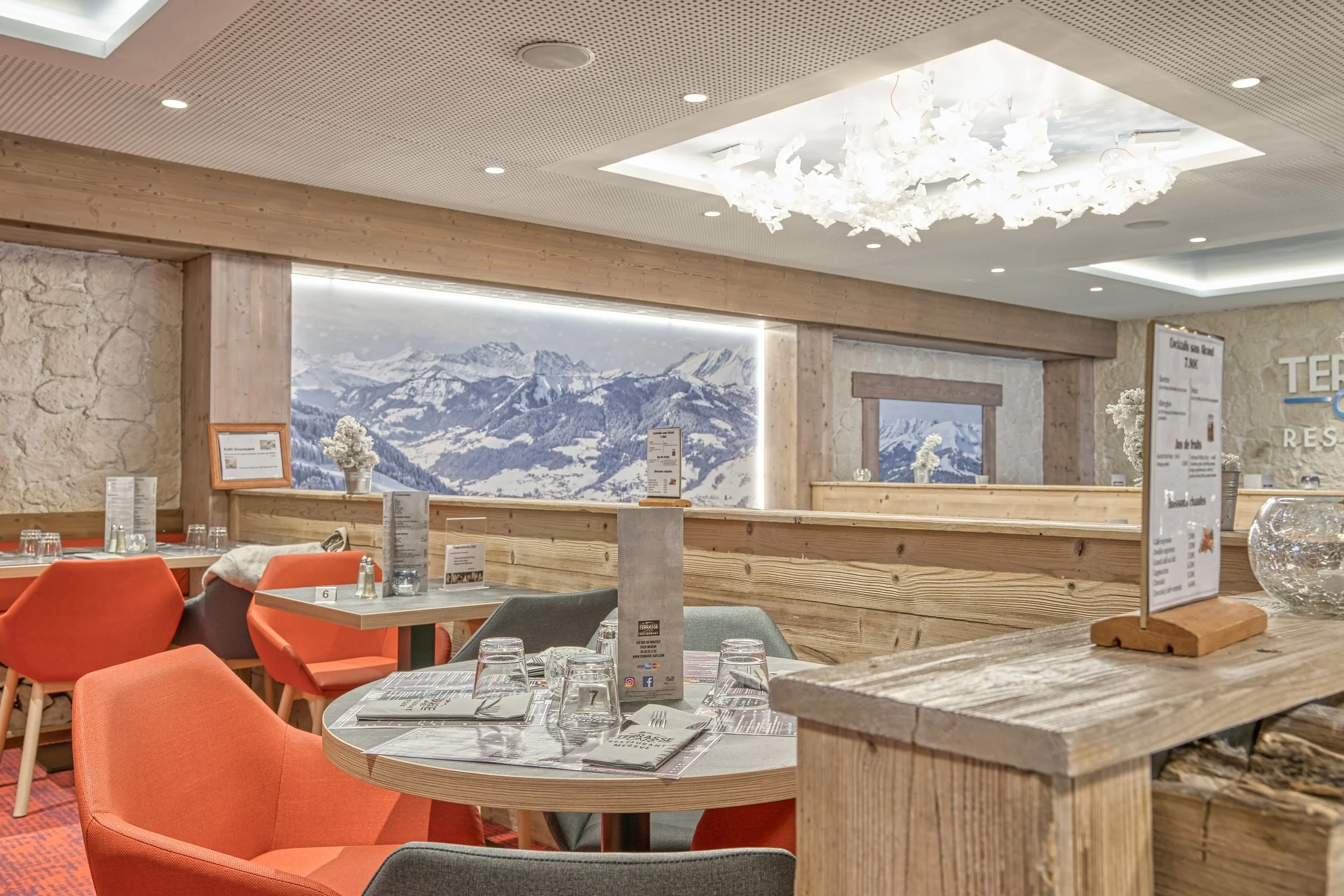 Aménagement d’un café-restaurant situé sur les pistes du domaine skiable de Megève, dans une ambiance chaleureuse.